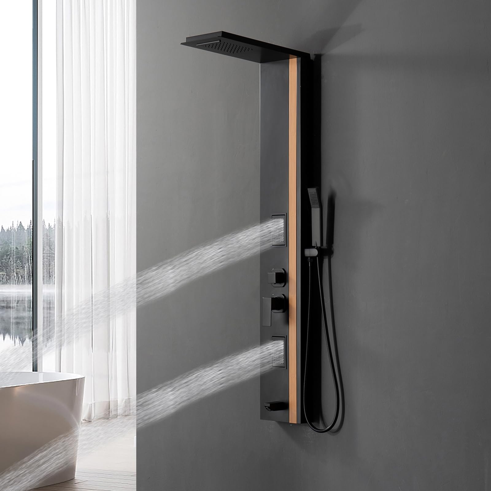 BWE Stainless Steel Shower Panel Tower System,Multi-Function Tempered Glass Shower Panel,Rainfall Shower Head Sprayer 8-Massage Jets with Tub Spout Hand Shower for Home Hotel Resort Split Type Black
