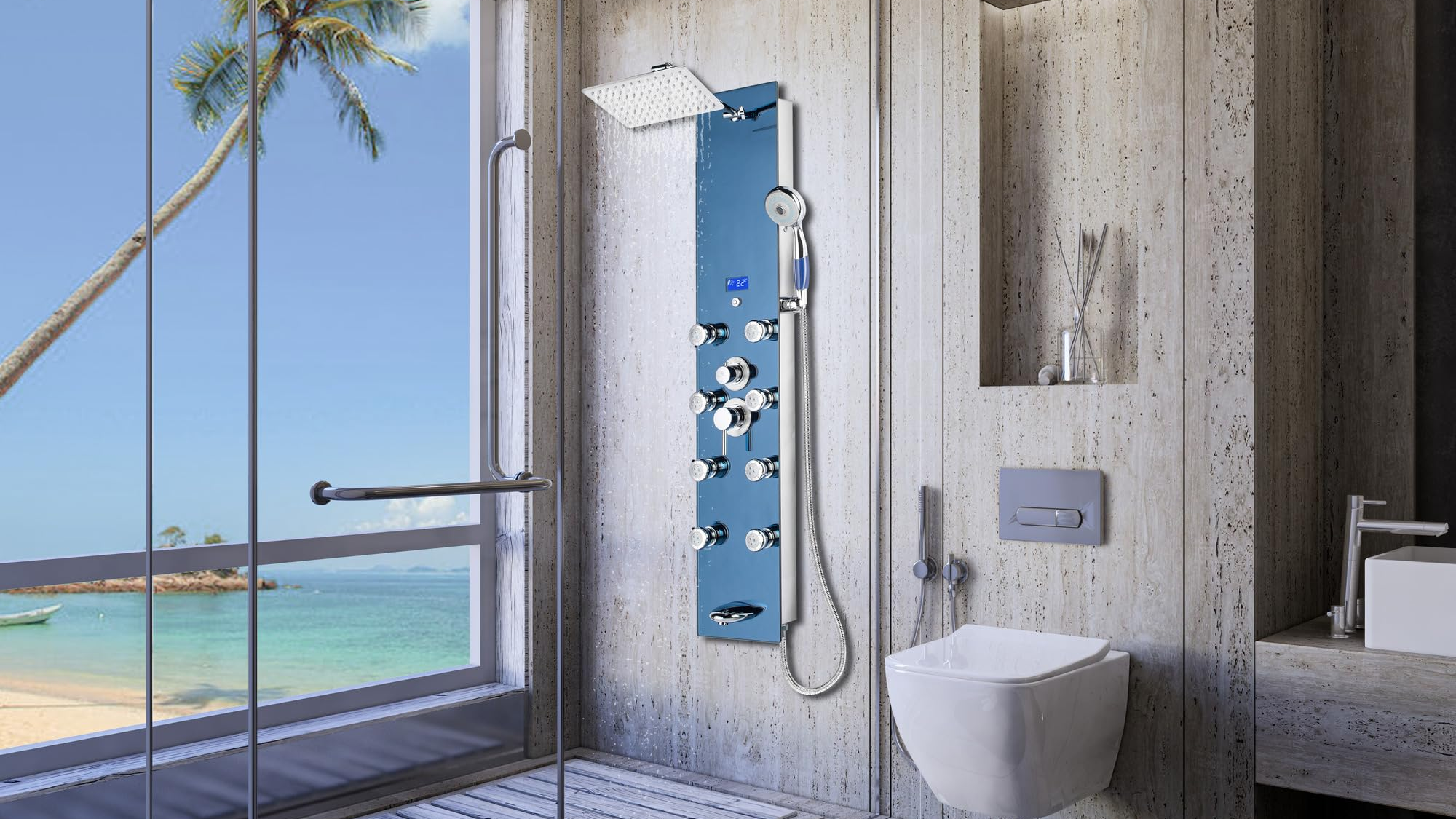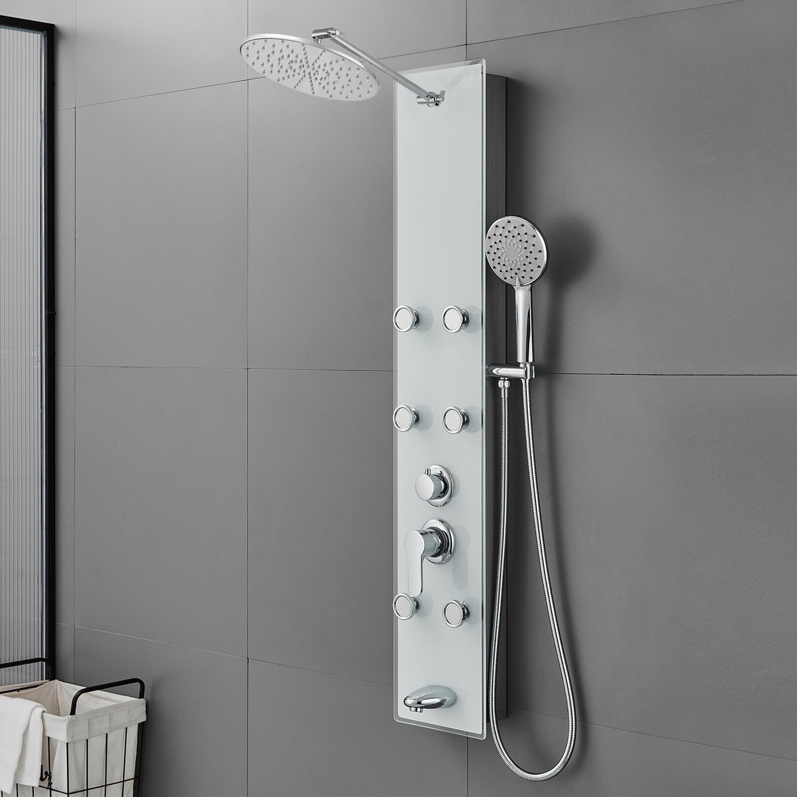 Blue Ocean 59” Stainless Steel SPS8819 Thermostatic Shower Panel Column System with Rainfall Shower Head, Body Nozzles, and Handheld Shower Head. Shower Tower